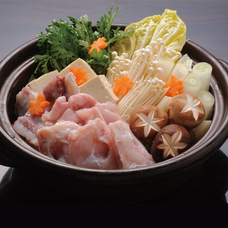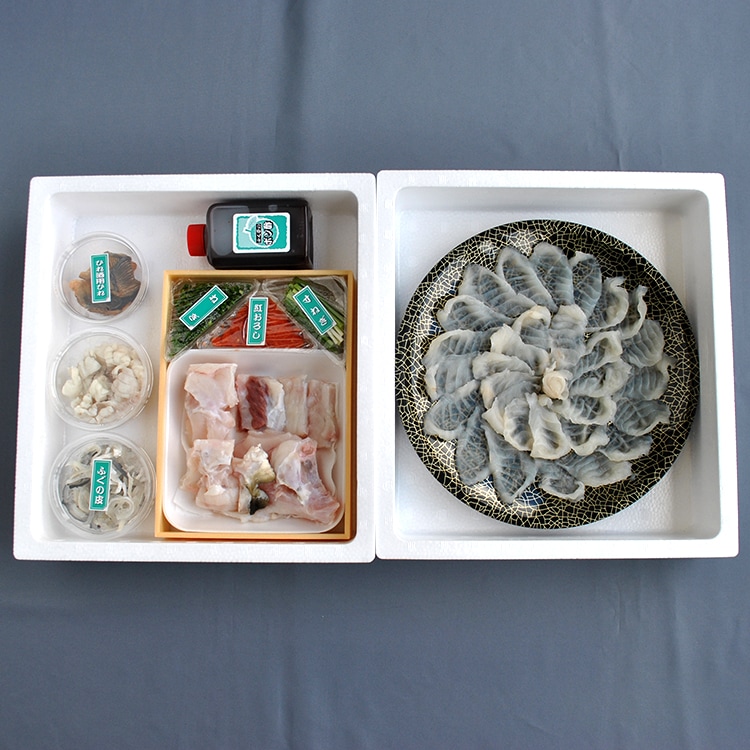 予約に合わせて水槽から鮮度の高いトラフグを捌いて即日発送するため、1日20セットと対応できる数量に限りがある。用意するのは野菜だけの「ふぐちり鍋」、品質と鮮度にこだわった「ふぐ刺し」、フグの香りがクセになる「ふぐひれ酒」、大分県産のカボスが香る「特製ポン酢」、爽やかな辛味の「もみじおろし」といった老舗料亭の味が、自宅で存分に堪能できる。