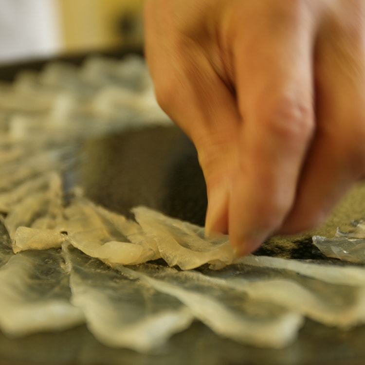 フグの刺身と言えば、皿の模様が透けるほど薄く切ったものを想像する方が多いのではないだろうか。しかし、大分県の東南部に位置する臼杵(うすき)では、フグを少し厚めに切るのだ。そうすることでコリコリとした弾力のある食感と、噛むごとに上品でほんのり甘いフグの旨みと身の風味まで味わえる。