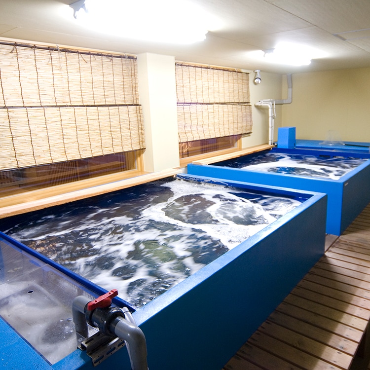 フグの中でも高級魚として知られているトラフグは、健康状態が日々変わりやすくデリケートな魚のため、与える餌の量や水温の調整など細やかな管理が必要で養殖コストも高く、生産量も少ない。そのため、老舗フグ料理専門店『ふく亭』(大分県臼杵)では、徹底した生育管理を行うフグ専門の養殖業者に依頼し、新鮮で高品質なトラフグを年間通して仕入れている。