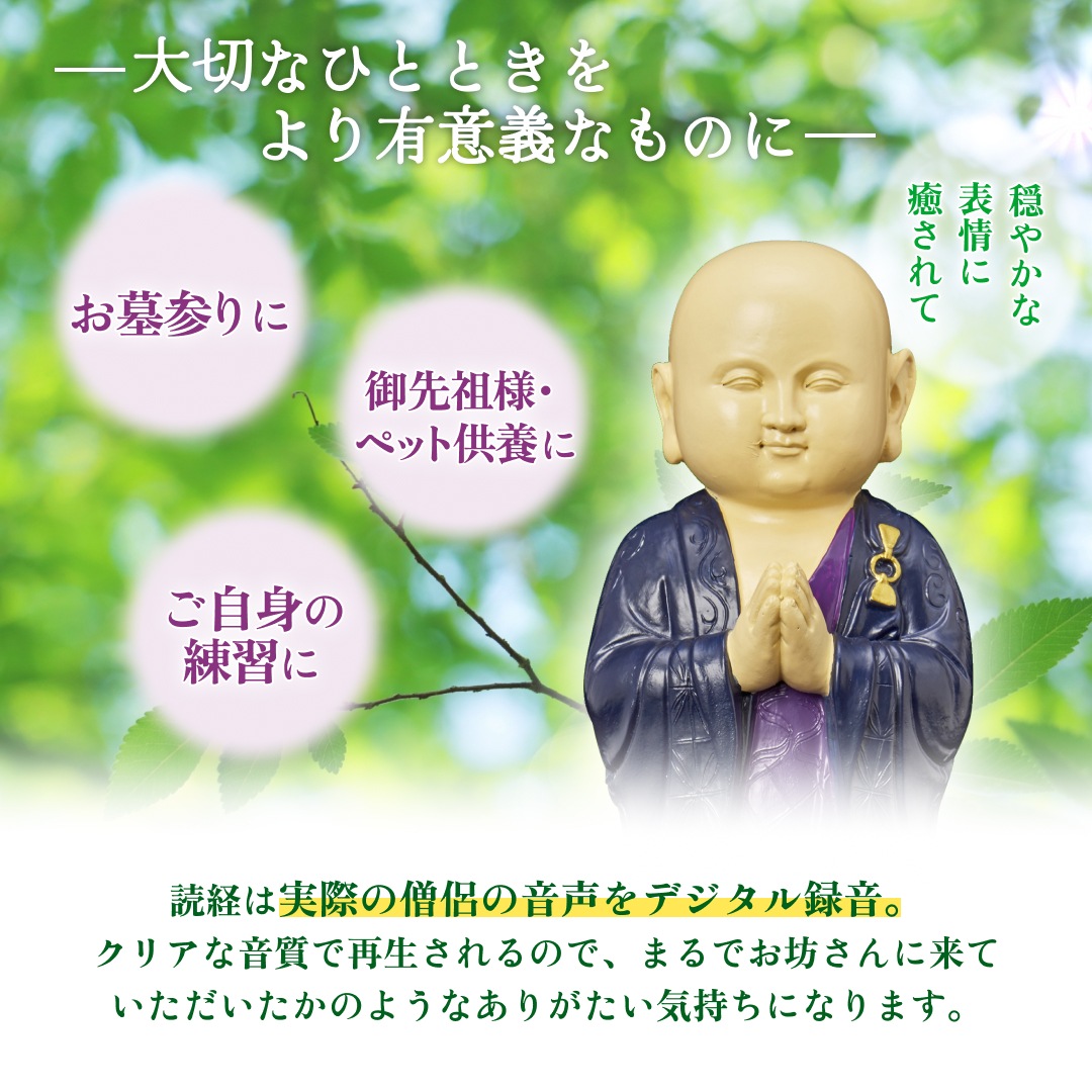 読経は実際の僧侶の音声をデジタル録音。クリアな音質で再生されるので、まるでお坊さんに来ていただいたかのようなありがたい気持ちになります。