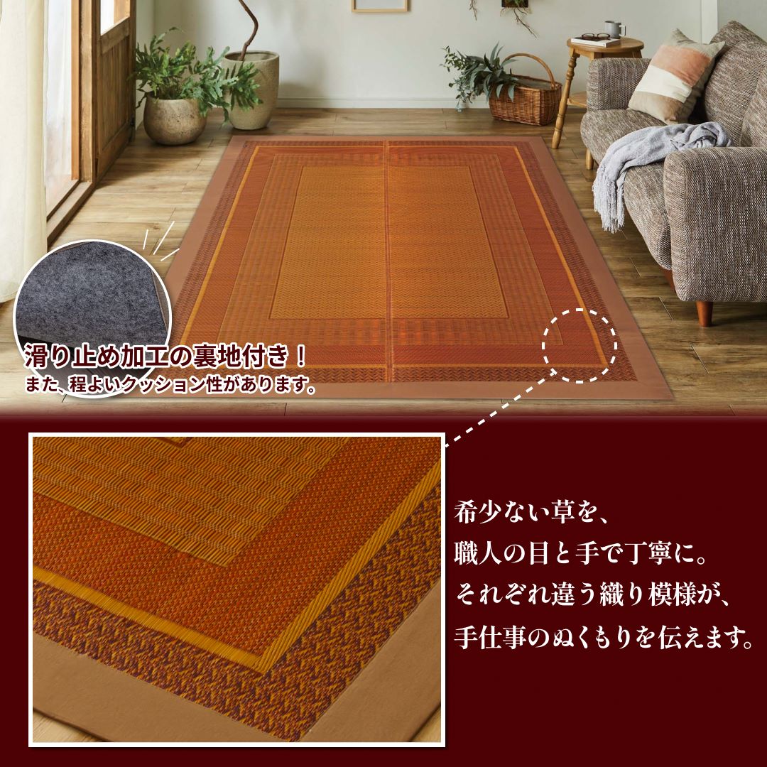 そんなお悩みに、耐久性と弾力性に優れた九州産のい草を使用し、熟練の職人が国内で丁寧に織り上げた、上質な自然素材のい草が解決。滑り止め加工の裏地付きで滑りにくく、床を傷つけず安心。また、程よいクッション性があります。