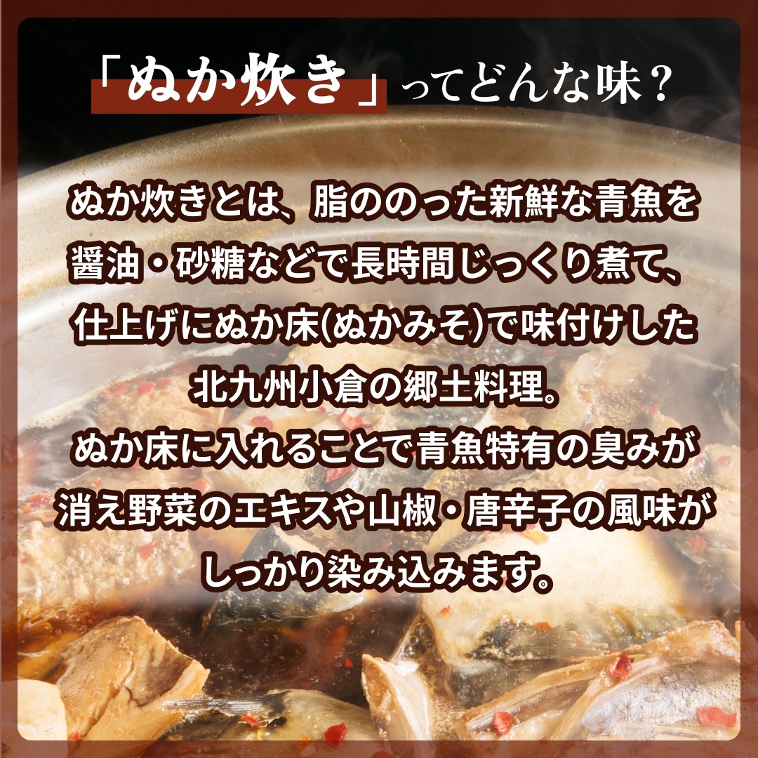 ぬか炊きとは、脂ののった新鮮な青魚を醤油・砂糖などで長時間じっくり煮て、仕上げにぬか床(ぬかみそ)で味付けした