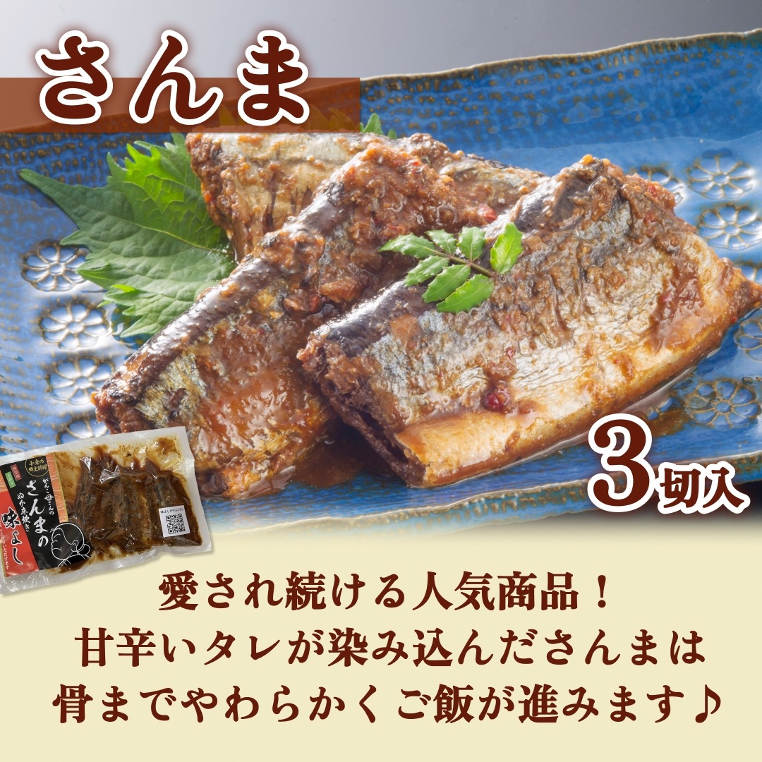 さんま(台湾産)、砂糖、水飴、醤油、魚介煮汁(さばを含む)、米ぬか、唐辛子、食塩、生姜、にんにく、昆布、粉からし、山椒、(一部に大豆・小麦・さばを含む)