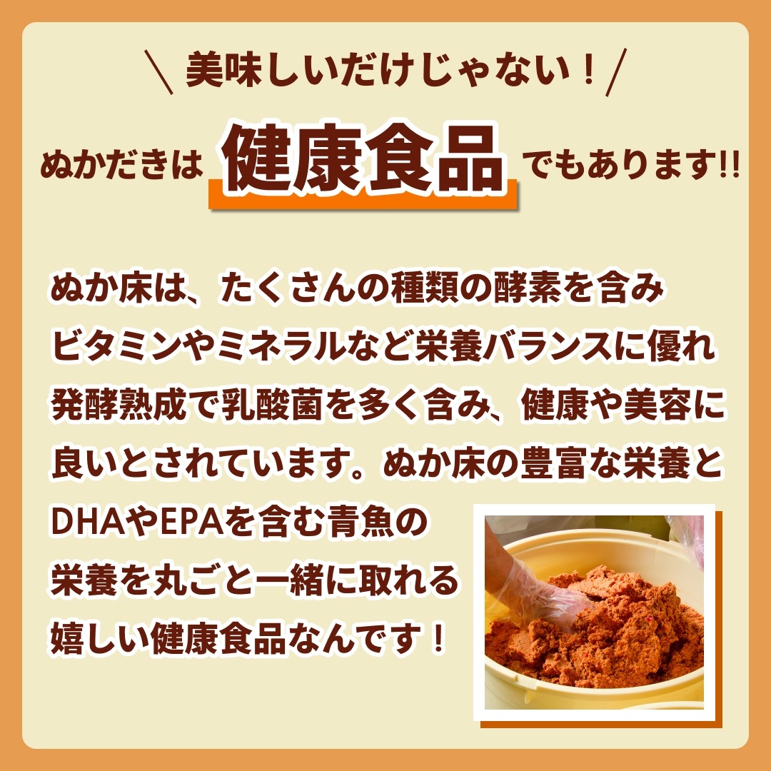 ぬか床は、たくさんの種類の酵素を含み、ビタミンやミネラルなど栄養バランスに優れ、発酵熟成で乳酸菌を多く含むため、健康や美容に良いとされています。ぬか床の豊富な栄養とDHAやEPAを含む青魚の栄養を丸ごと一緒に取れる嬉しい健康食品なんです!