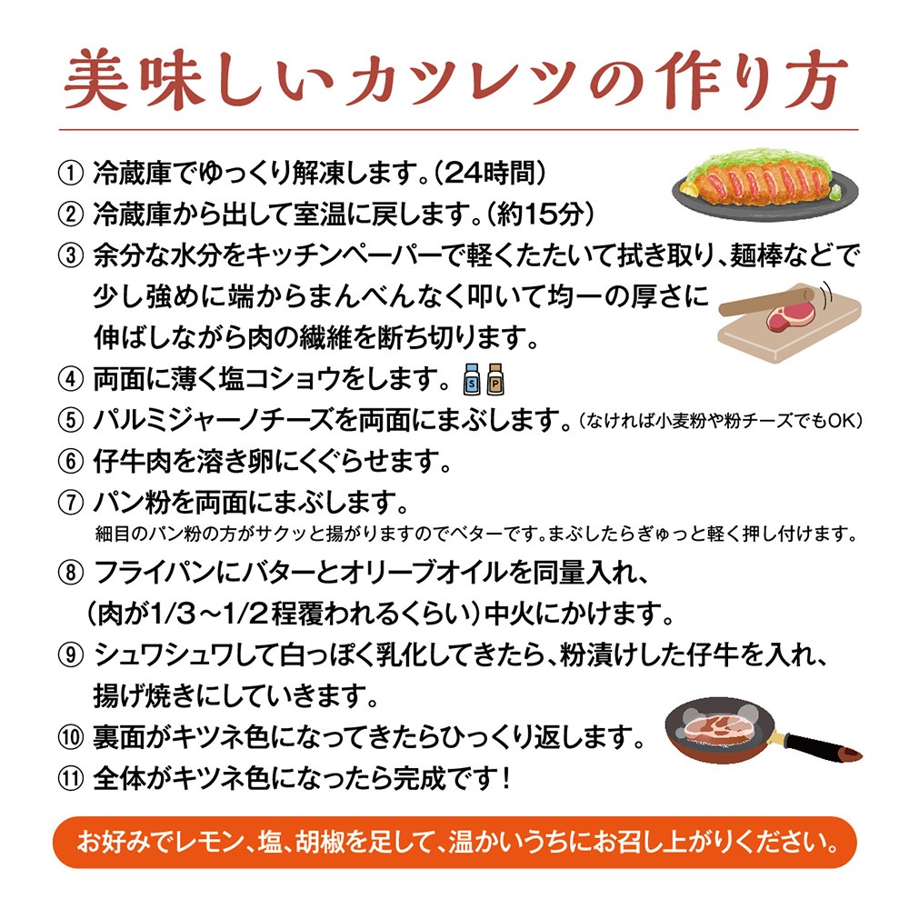 また、1cmほどの厚さで食べやすいカツレツ用の赤身肉もご用意。小麦粉・溶き卵・パン粉につけて焼くように揚げれば、カツレツの出来上がり。カナダ産仔牛の厳選したお肉を現地で良質な状態のまま個食パックにしてお届けします。