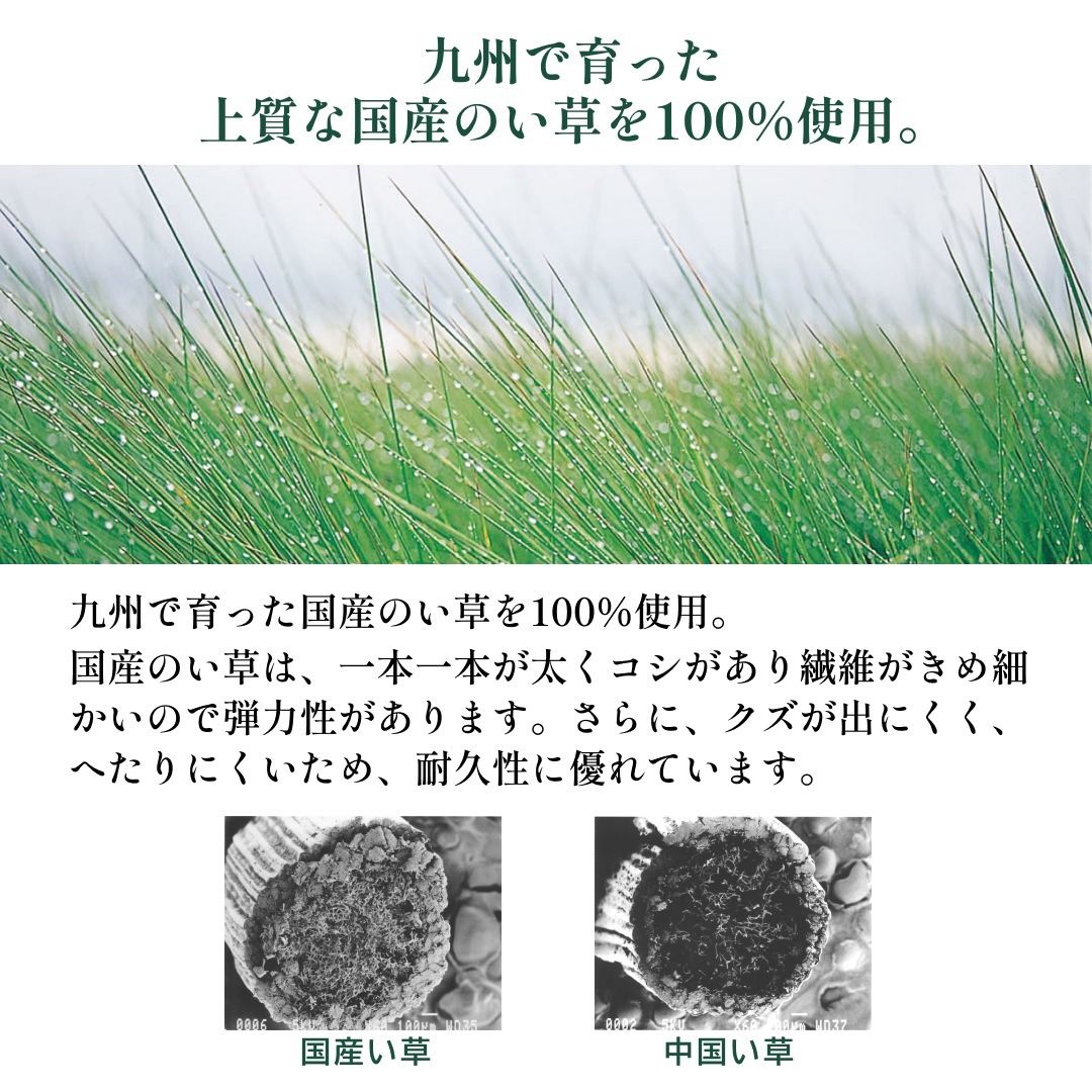 国産のい草は、一本一本が太くコシがあり、繊維がきめ細かいので、弾力性があります。