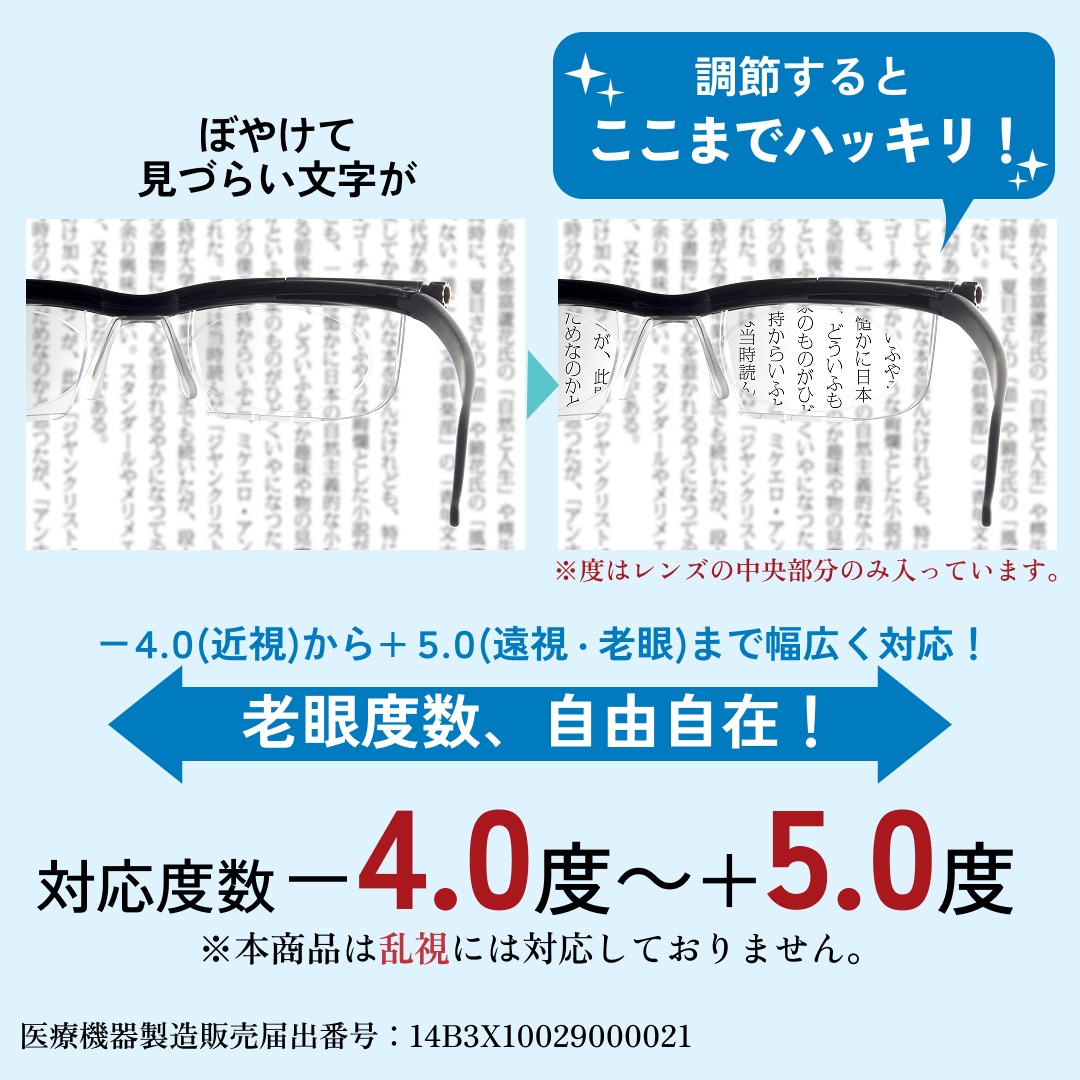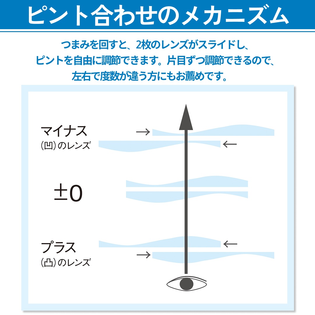 ・補正度数:-4.0D(近視)~+5.0D(遠視・老眼)の度数の幅内で調整可能