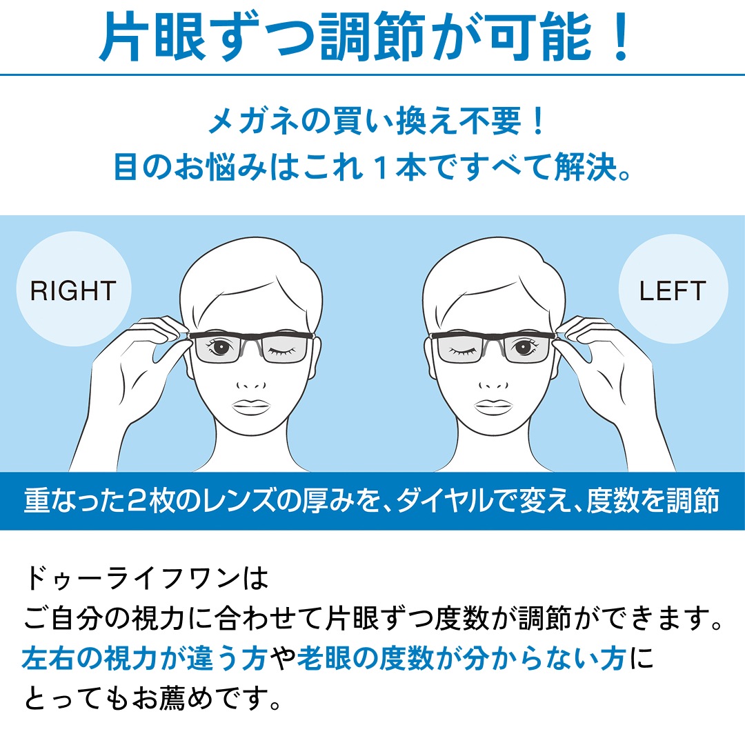 ドゥーライフワンは、必要に応じて、ツマミを前方又は後方に回すことで、近視、遠視、老眼の全てに対応できる革新的なインスタントメガネです。