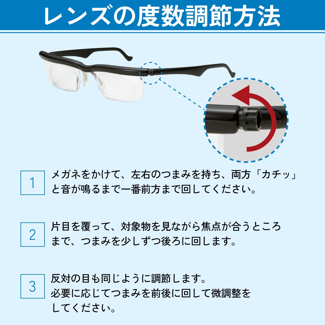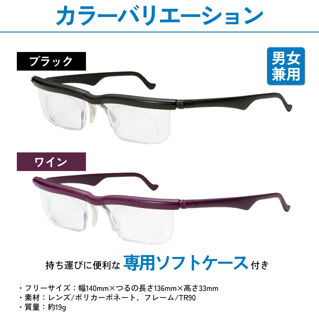 左右片方づつ自由にピント調節ができ、老眼も近視も遠視もすべてこれ1本でOK!