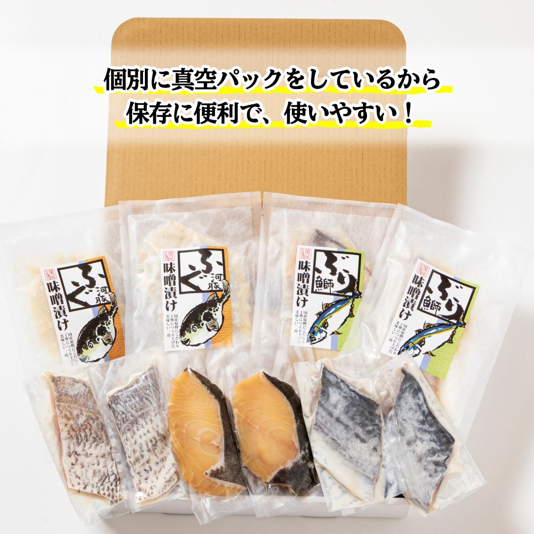 銀だらみりん 70g×2、さわら粕漬 80g×2、真鯛粕漬 60g×2、ふぐ味噌漬(1切 30g×2切入)×2、ぶり味噌漬(1切 20g×3切入)×2